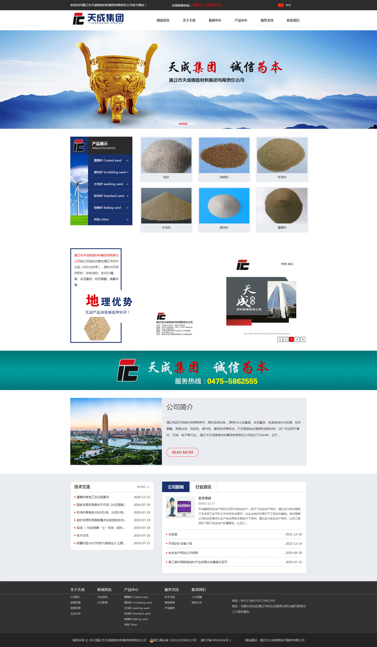 通遼市天成鑄造材料集團(tuán)有限責(zé)任公司成立于2004年,位于科爾沁大草原的科爾沁砂帶,東北交通樞紐,這里交通便利、環(huán)境優(yōu)美、景色宜人。礦區(qū)位于通遼市科爾沁左翼后旗努古斯臺鎮(zhèn),礦區(qū)占地面積為0.0246平方公里臨近北京市、河北省、遼寧省距離錦州港300公里左右。公司現(xiàn)有員工100人左右,工程技術(shù)人員30余人。年產(chǎn)覆膜砂5萬多噸:年產(chǎn)擦洗砂、水洗砂等其它品種30余萬噸。