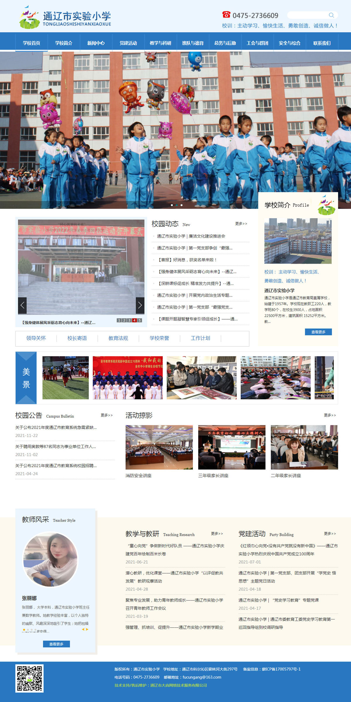 通遼市實驗小學是通遼市教育局直屬學校,始建于1957年。學?,F(xiàn)在教職工220人,教學班80個,在校生3900人,占地面積22500平方米,建筑面積 15252平方米。教師隊伍中具有大專以上學歷的195人。具有研究生碩士學位畢業(yè)的9人,小學特級教師4人,高級教師57人,小學高級教師70人,小學一級教師87人。